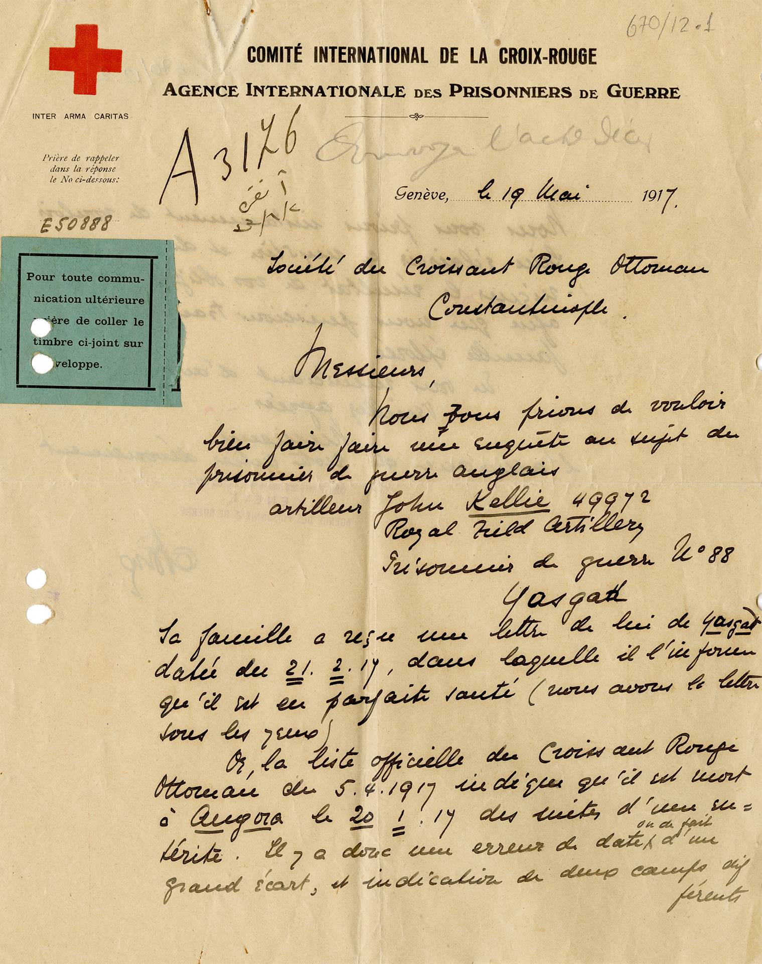 Uluslararası Kızılhaç Komitesi Cenevre Savaş Esirleri Ajansından 19 Mayıs 1917 tarihinde Osmanlı Hilâl-i Ahmer’e yazılan mektupta, Yozgat’taki İngiliz savaş esirlerinden 49972 numaralı Kraliyet Sahra Topçusu 88 esir numaralı John Kellie hakkında bir soruşturma yürütülmesi rica edilmektedir. Ailesine önce sağlığının mükemmel olduğu ardından daha erken bir tarihte vefat ettiği bildirilmiştir. Bulunduğu yer için iki farklı kamp bilgisine işaret edilen asker hakkında bilgi ve tarih tutarsızlığının çözülmesini, kederli ailesinin içinin rahatlatılması rica edilmektedir.