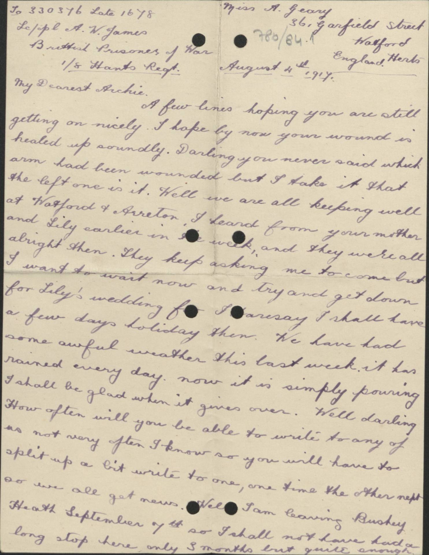 A few lines hoping you are still getting on nicely. I hope by now your wound is healed up soundly. Darling you never said which arm had been wounded but I take it that the left one is it. Well we are all keeping well at Watford and Arreton. I heard from your mother and Lily earlier in the week, and they were all alright them. They keep asking me to come but I want to wait now and try and get down for Lily’s wedding for ***say I shall have a few days holiday then. We have had some awful weather this last week. It has rained every day. Now it is simply pouring. I shall be glad when it gives over. Well darling how often will you be able to write to any of us. Not very often I know so you will have to split up a bit. Write to one, one time the other next, so we all get news. Well I am leaving Bushey Heath September 7th so I shall not have had a long stop here. Only 3 months but quite enough.
